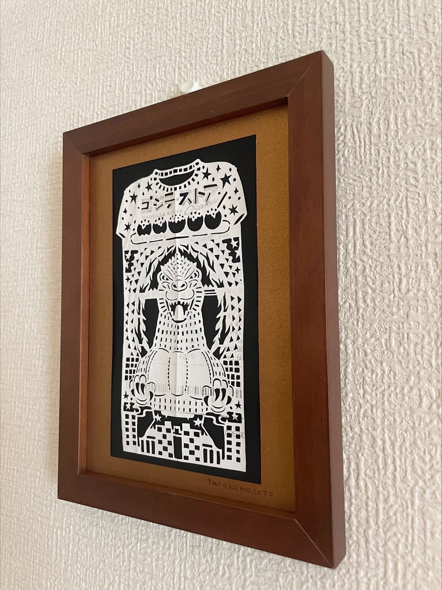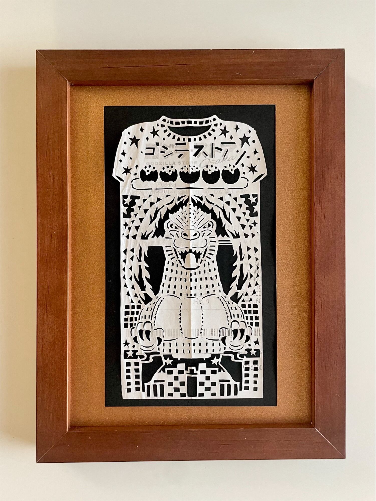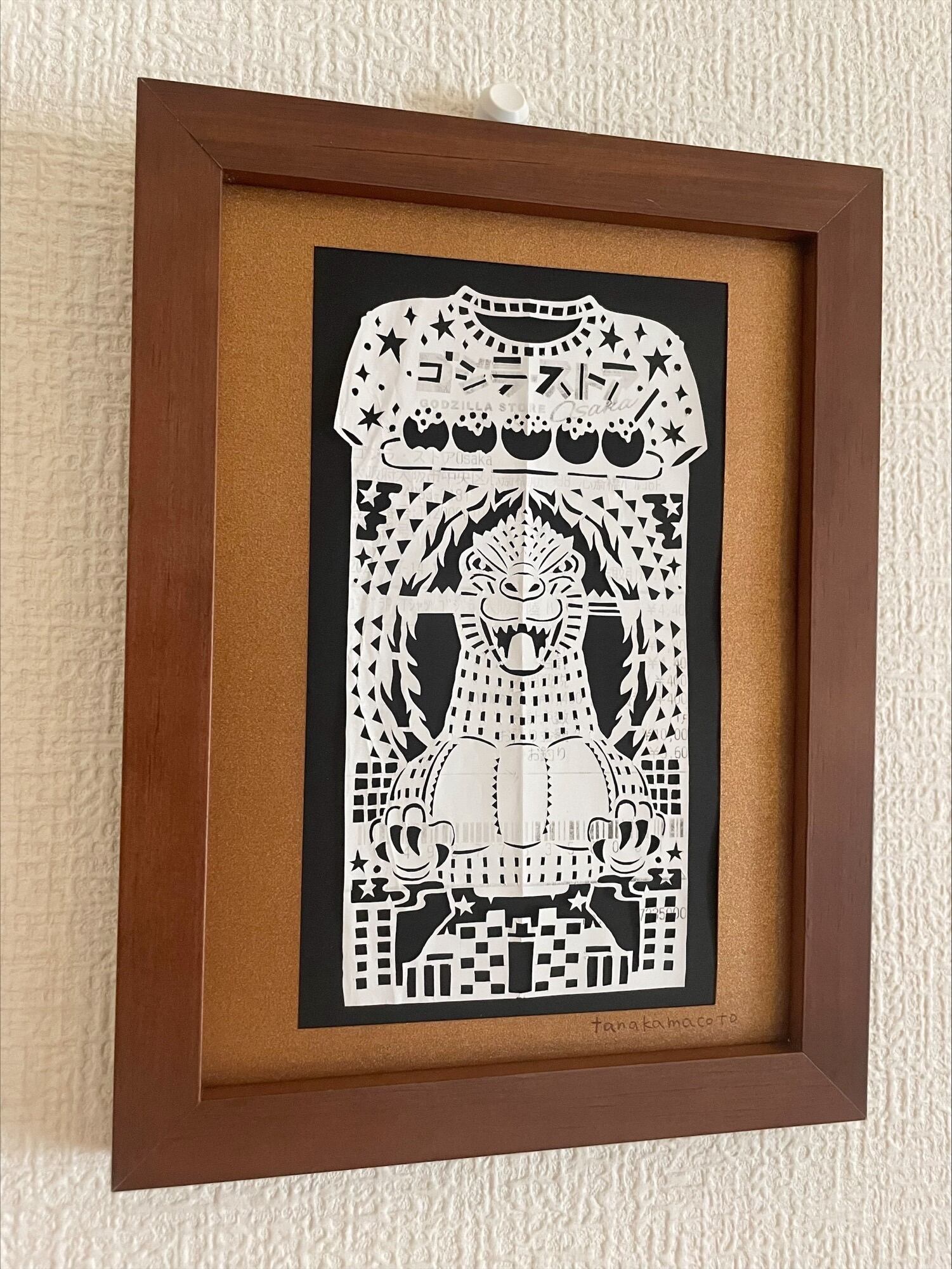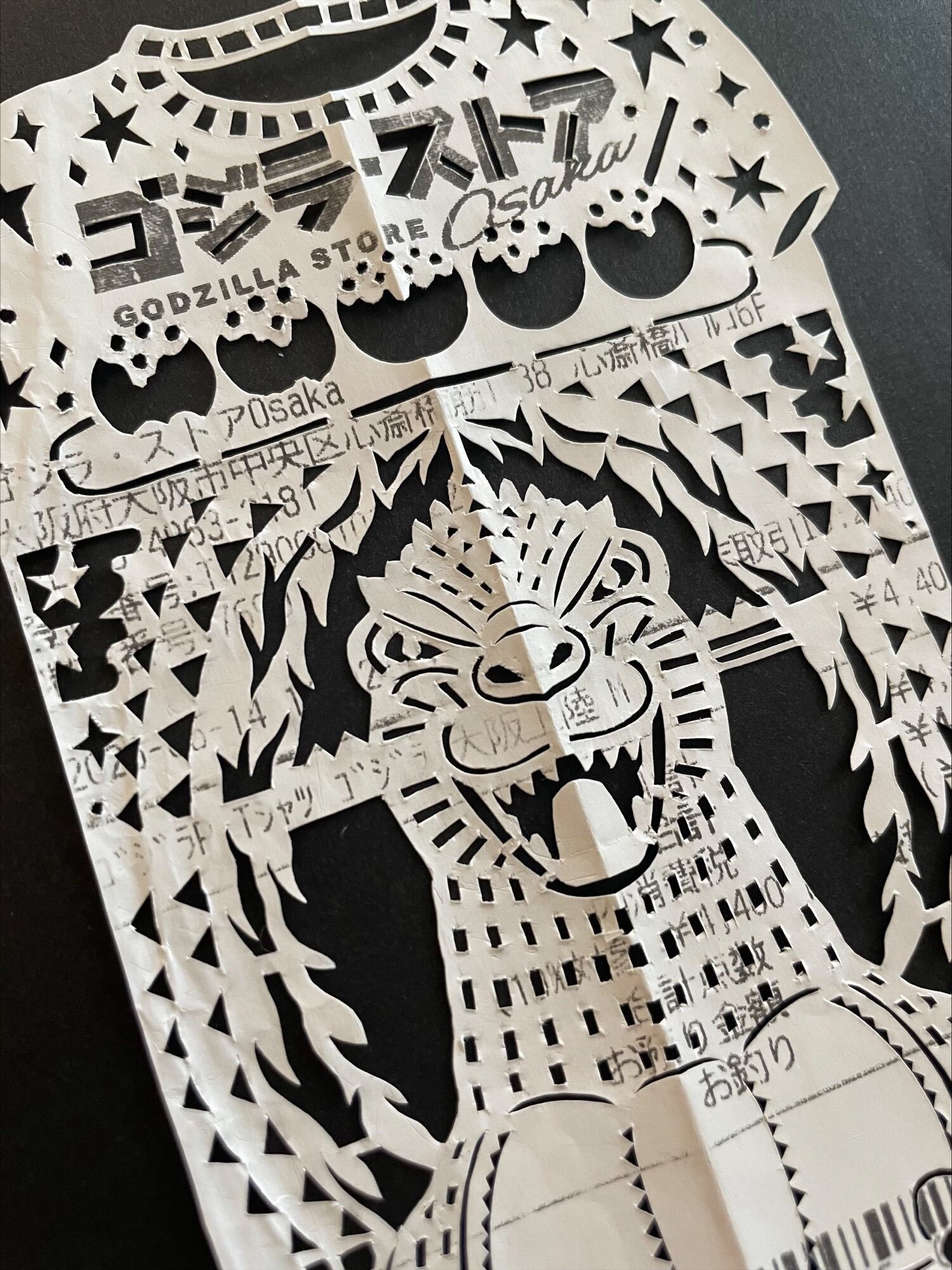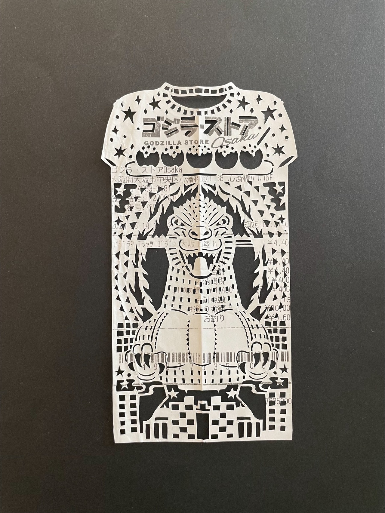 ゴジラのTシャツをお土産に購入されたレシートとのことだったので、Tシャツの形にして、真ん中に大きくゴジラを切り抜きました。